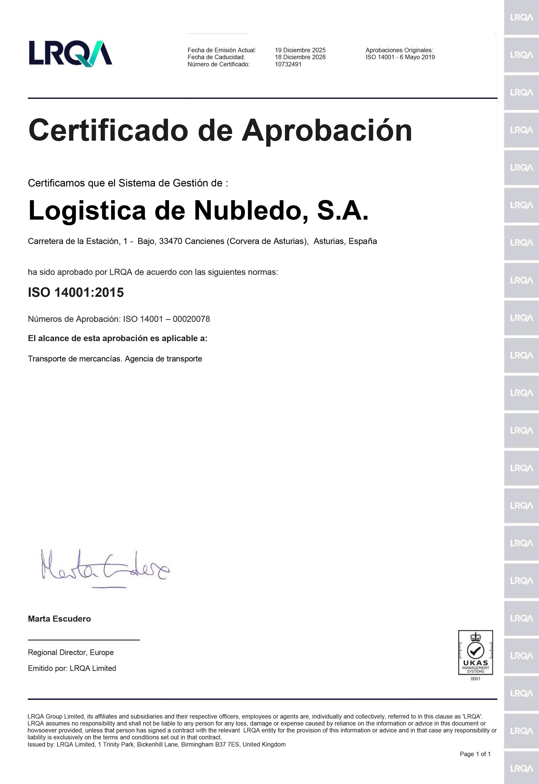 Paralelamente al proceso anterior y para completar el abanico de servicios que la empresa quiere prestar a sus clientes y colaboradores, se realizó la certificación ISO 14001:2015 para Medio ambiente la cual igualmente se hizo tanto para el Transporte de Mercancías como para la Agencia.